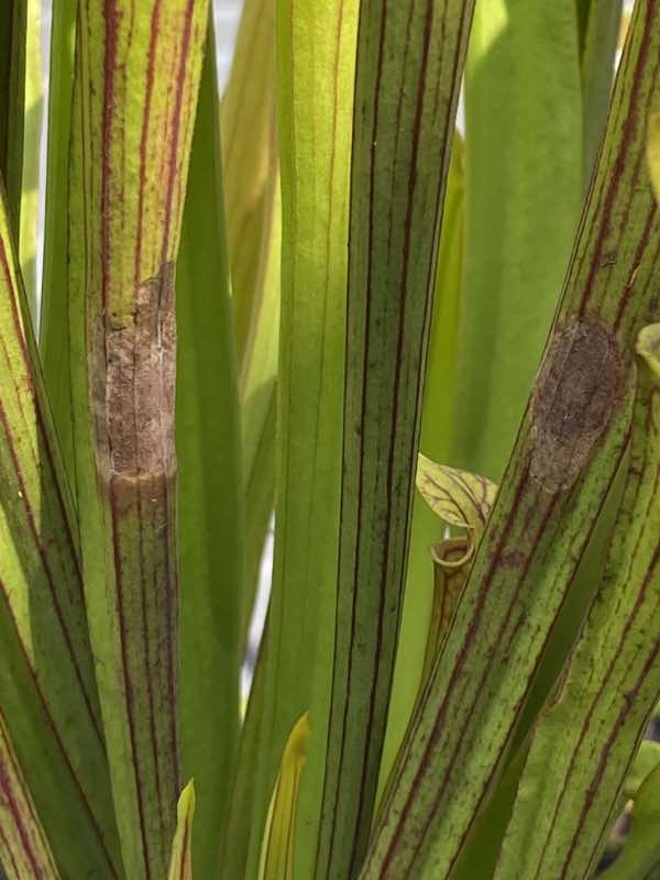 I just purchased this Sarracenia in July, and have noticed these brown spots forming on some of the sides of the pitchers. Is this from pests or disease, and what should I do? Thanks